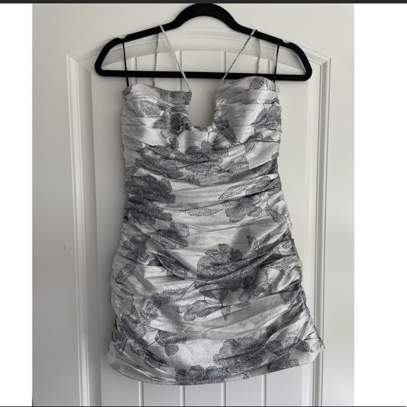 Zara metallic dress. Size M. Brand new with tag. String tie at the neck and zipper closure at the back. No trade. Nonsmoking and pet free home. Box10. Measurements: top of the dress side to side is 15” but it can stretch more due to the stretch material at the back. See the last pic. Length is 24.5”.