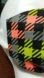 Neon 80s Style plaid in neon orange and green with grey and black checkerboard plaid. Plain black on the other side.