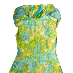 Sheer polyester material with detailed 60s floral print; solid green lining