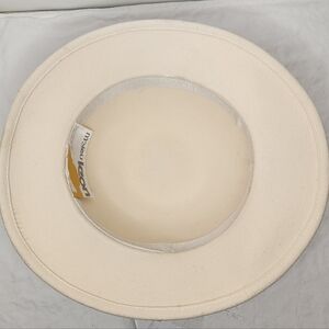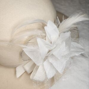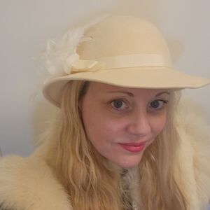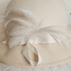 Cream Wool Bowler Fedora Cocktail Bridal Hat with matching Ribbon Hat Band and Floral Feather Detail, by M'Sieu ICON.