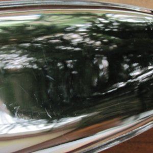 This is a very cool piece from the mid century era - reminiscent of Eames styling. This is a "Gourmates styled by Glo-Hill Canada" serving tray (and still has its sticker!). Glo-Hill was a Canadian Company from Montreal that produced high end chrome and bakelite items in the 1930 to 1970 era, and their pieces are currently making a huge resurgence in the home decor market. This long and slender chrome tray has the signature deep red bakelite handles and feet. It measures 15 inches long (including handles) and 5 1/4 inches wide at the middle.