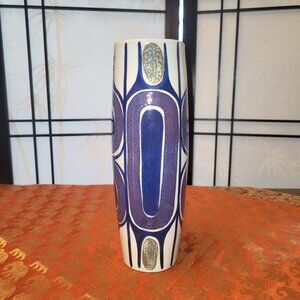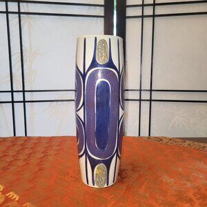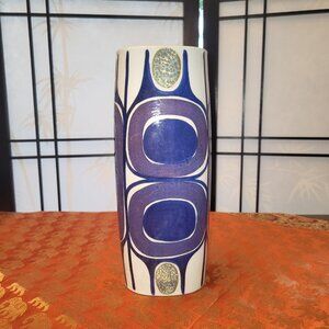 This stunning Danish Mid Century Modern ceramic art vase will make a stunning addition to your home. Designed in the 1960s, this Royal Copenhagen Tenera vase is part of a limited edition run (#450/3116) and is signed by the artist, Inge-Lise Koefoed. Coloured using blue, purple and shimmering pale yellow/gold on white, this MOD Scandinavian piece would be an outstanding edition to your living room, dining room or home office.