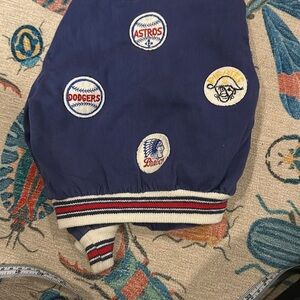 Retro jacket featuring MLB team patches. Bold blue color with team logos.