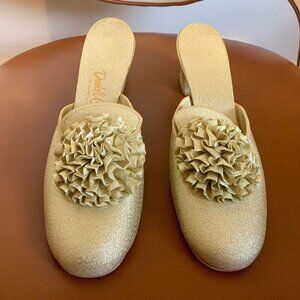60s Vintage Gold Sparkle Ruffle Slipper Heels by Daniel Green, Made in USA