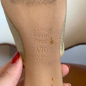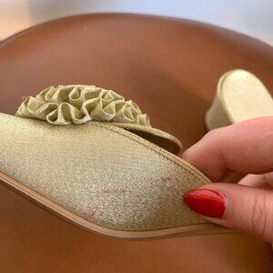 60s gold sparkle ruffle slipper heels. Just be warned that the toes are quite narrow, so the sizing may need to go down due to how narrow they are! Lovely little heels made in the US by Daniel Green. In great condition, does have some scuffing on the bottom of the soles and a mark on the side of the right shoe (as pictured).