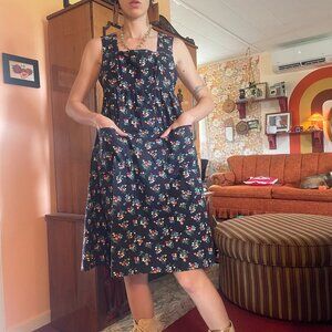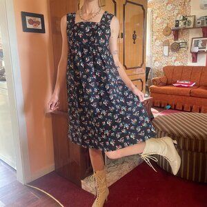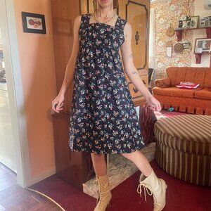 60s mod handmade black and blue floral print square neck empire waist a line dress with pockets! This is SO cute-- this dress is clearly handmade and features two big front pockets AND an empire waist! This dress is made of a stuff material, likely cotton! This features a Talon zephyr zipper which we're only present on clothing in the 1960s and 70s! Based ont he style of similar clothing patterns at the time this was dated to be a 1960s prairie mod dress!