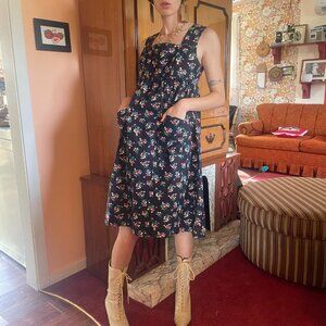 60s mod handmade black and blue floral print square neck dress with pockets!