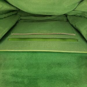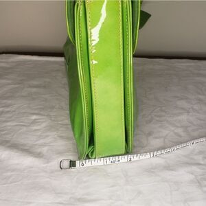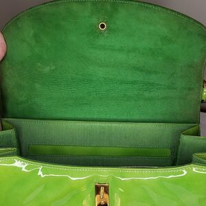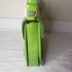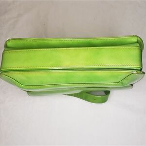 Rare Vintage Mod 1960s shiny lime green patent leather flap front cross-body shoulder purse with matching green suede & nylon ribbon lining.