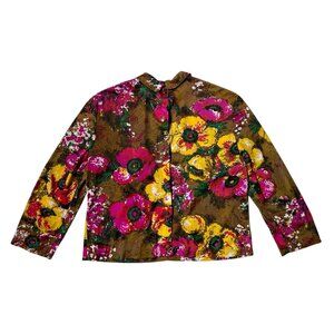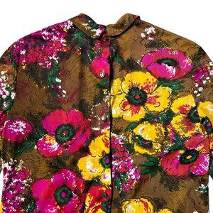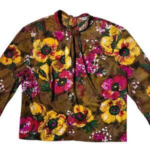 60s vintage abstract floral blouse 3/4 sleeve twisted collar short Kay Silver.