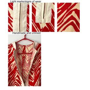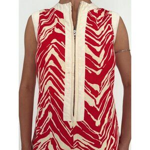 this is a gorgeous vintage playsuit romper from the late 60s featuring a bright and striking red and cream abstract print design – the construction of the garment feels handmade, likely making it one-of-a-kind! the sleeveless romper features a high neckline, wide leg mini shorts, and a metal zipper that zips down the front (the zipper was recently professionally repaired/replaced). the fabric feels like a thick canvas/woven cotton twill fabric with no stretch, and is unlined. the fit of the playsuit is fitted yet relaxed, making it super comfortable to wear (like a second skin) and perfect for summer!