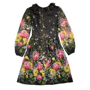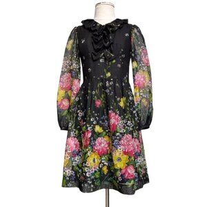 60s vintage black flower dress with ruffle collar and sheer sleeves