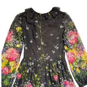Sheer long sleeves, ruffle collar, metal zipper at back, flared skirt, hits around knee