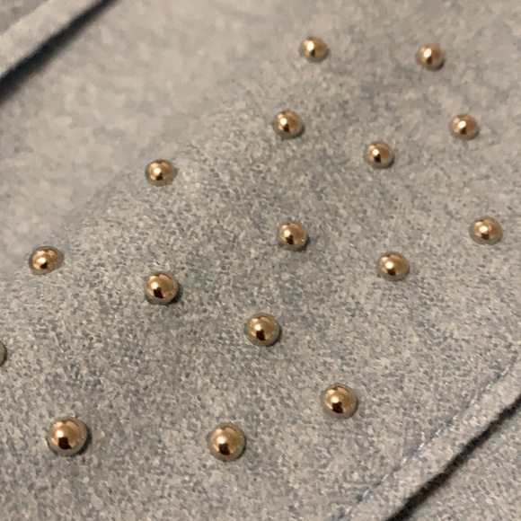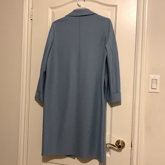 Baby blue with studded collar. 100% virgin wool. Made in Italy.