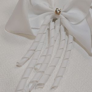 • White grosgrain w/rhinestone in gold colored setting ~ decorated w/ curled grosgrain ribbon ~ alligator clip ~ 6" x 4" curls hang approx 5"
