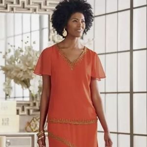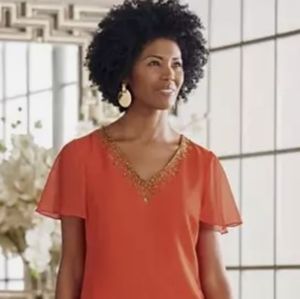 Ashro "Annabel Bronze Beaded Top" Sz. 6(S) Orange. Beaded "V" neck top with flutter sleeves. Must bundle 3/$6 items for discount.