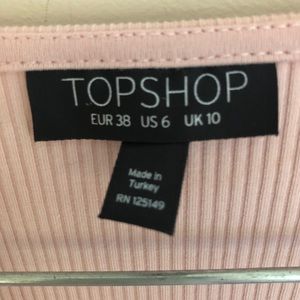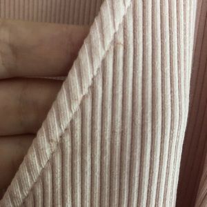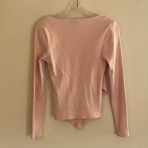 Light dusty pink asymmetrical wrap top from Topshop with ribbed fabric, long sleeves, and v neckline. There is a small mark, as pictured. It’s hardly noticeable. Size 6. Approximately 14.5 inches from pit to pit and 20.5 inches from shoulder to hem. 95% cotton 5% elastane. Machine washable. Smoke free and pet friendly home!