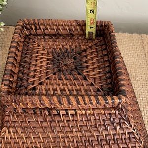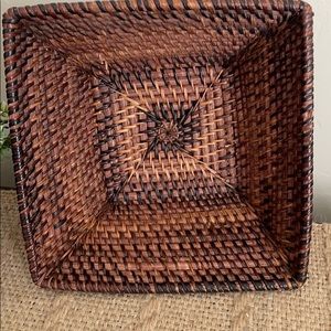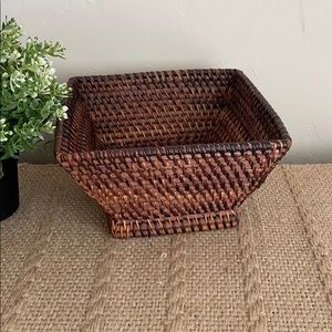 This is a decorative woven Basket. It is previously owned in good condition. Please note that is is a little lopsided. It is perfectly imperfect. See photos for details.