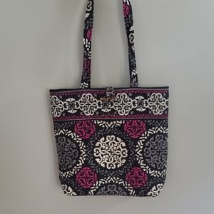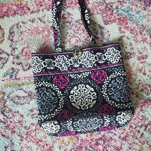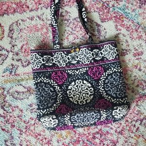 Brand new Vera Bradley tote. Medium size. Measurements are available if needed.Purchased, never used, kept in storage. Black, dark purple & white geometric print. Pockets inside wall of tote. Excellent condition, not used. Smoke and pet free home.