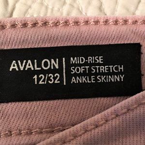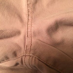 Mid-Rise, Soft Skinny Stretch. Branded button and rivets. Clean, crisp design. A couple popped stitches near crotch in front (see last photo)