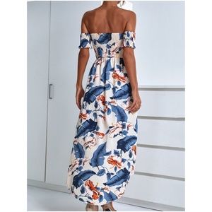 Boho Blue Floral Tropical Leave Off Shoulder dress