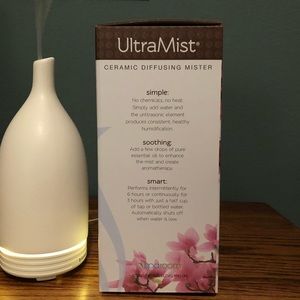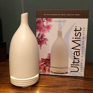 Sparoom Ultramist white ceramic essential oil diffuser. Features 3 hour continuous operation with automatic shut-off.