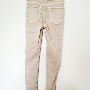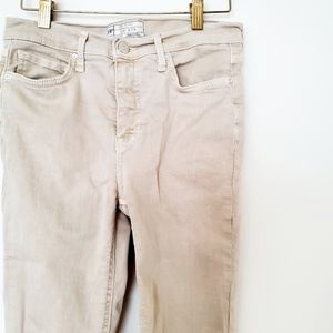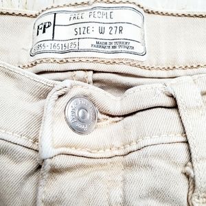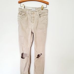 Free People khaki denim skinny jeans with stretch and distressed knee cut-out. Good condition, no visible issues. Approximate measurements: