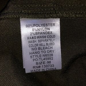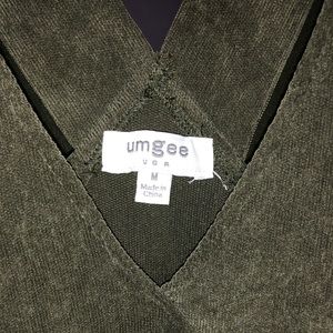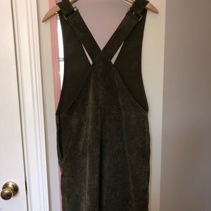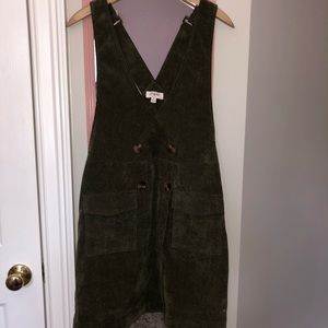 Olive green corduroy dress. Never worn, in perfect condition. Pockets are fully functional, buttons are just for show. Can be worn with or without a shirt underneath if you have the right bra or have smaller boobs. Straps are non-adjustable. I am 5’6” and it comes down to about mid-thigh. Super comfy and relaxed style! Size M - I am usually a size 8/10 and it fits me relatively loosely. Great for fall. From a smoke and pet free home.