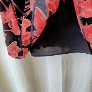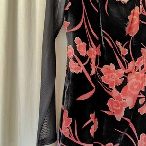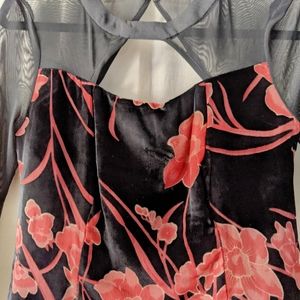 New with tags, Generation, size 6, Mini dress, measures bust at 15" across. Fits b, c and d cup. black combo, elveteen mixed sheer sleeve and next decollete floral dress. Fully lined, hook and eye, zipper pull in rear.