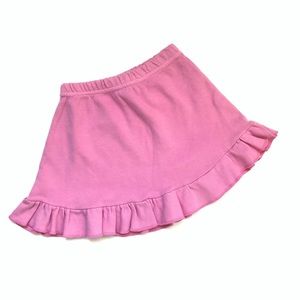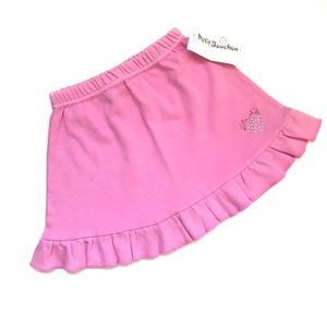 Petit Bouchon pink ruffled hem skirt with elastic waist. Rhinestones heart detail. 100% cotton.