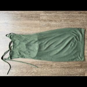This is a faux suede, olive green dress with super soft material and a good stretch. It is about mid thigh length. This dress is from a boutique called Windsor, size small. I wore this dress once. The strings in the back make the top half of the dress very adjustable