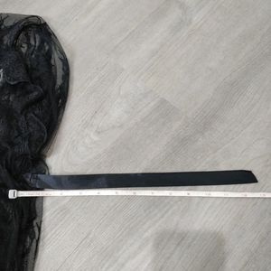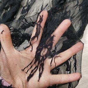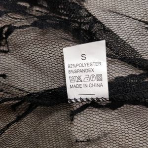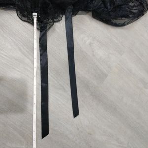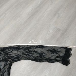 Long sleeve, soft, delicate, sheer, black floral detail lace, lace trimming too, two ribbons sewn to the front to tie it closed. Slightly stretchy, extent of stretch demonstrated in video, measurements in photos. Never worn, no flaws, ships in a day from my smoke-free pet-free home.