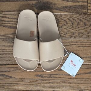 These beauties are in very good used condition. Wedge heel measures 1.5 inches high. Man made upper is in fantastic condition with no scuffs or marks. Beautiful gold detailing. Size 7 1/2.