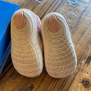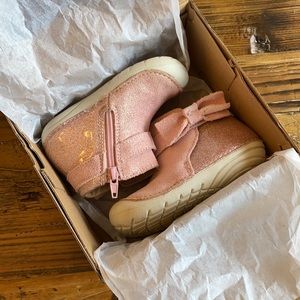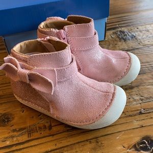 Excellent used condition stride rite style Genevieve in pink suede With adorable bow on the side and glitter in the back heel. These boots have a zipper on the inside of each boot and they’re super cute only worn a handful of times. Can ship with or without the box. Passing through a smoke free, pet friendly home.