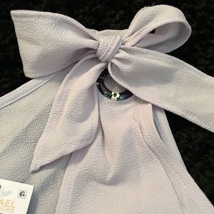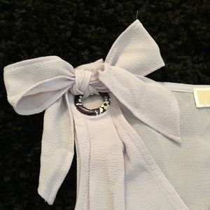 Beautiful lightweight lavendermist v-neck blouse. A nice wardrobe staple. A tie on each shoulder that comes out of a black, blue, and white designed grommet. Wear it with a tied bow or with the ties flowing depending on the mood or occasion.