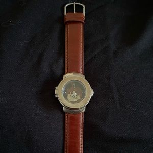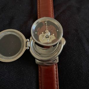 Warner Bros. Taz watch. Brown leather band, silver face with pop out Taz when open. Excellent condition. Needs battery. Worn couple times.