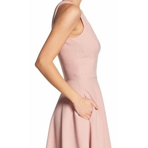 The Catalina is a crepe cocktail dress with a fit and flare silhouette and a v-neckline that flatters all body shapes. The bodice is fitted and tapers in to hug the waist, and the knee-length skirt is playful but polished. This blush sleeveless dress has modest straps wide enough to cover the shoulders and two side pockets.