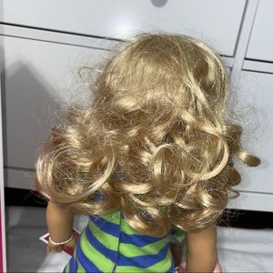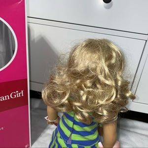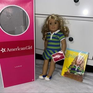 American girl doll Lanie with original box and meet outfit! Beautiful curls and shiny hair but needs to be brushed. She includes her shoes (slight scuffs as shown), underwear, dress, and book. Missing her headband. Over such a gorgeous doll and in really good condition.