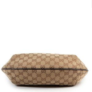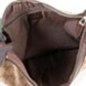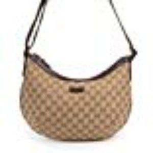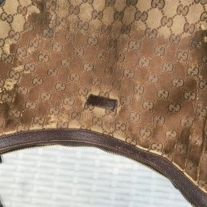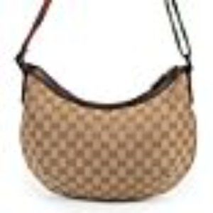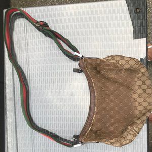Gucci cross body bag with guccisima monogram on beige canvas. Finished with beautiful dark brown leather and metal hardware. Interior is spacious with a zippered pocket. Green/red/green adjustable strap makes this the perfect piece- versatile, yet says"Gucci". Significant wear/tear on exterior and strap- see photos.