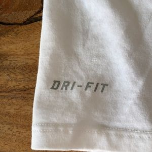 White Nike Dri-Fit T-Shirt with logo and swoosh on front in Navy. Cotton blend. Nice stretch!