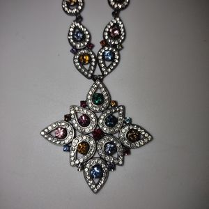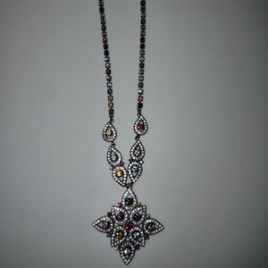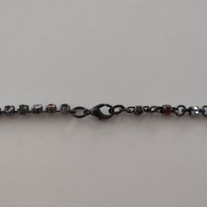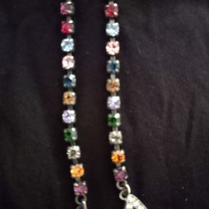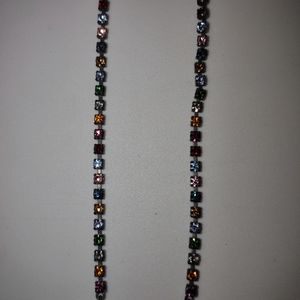 Clear rhinestone create teardrop shape with larger color rhinestone in middle of each teardrop. Multi color rhinestones create the "chain".