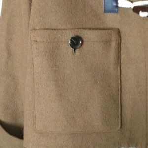 Zipper and wooden toggle/rope closure. Pocket on inner lining of left side.