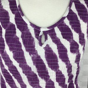 Perfect summer dress purple/white with elastic smocking at bodice, sleeveless with keyhole accent at scoop neckline.