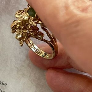 This is a gorgeous jade and rhinestone 18KT high gold electro plated (HGE) ring. The gold plating is thick and won’t fade away easily. The ring mount is probably made of base metal. It is a size 7.0 and is stamped 18KT and HGE on it’s shank. In excellent vintage condition.
