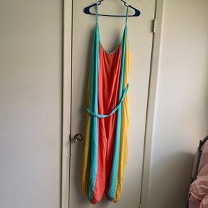 Orange, blue and yellow sleeveless jumpsuit with elastic banded bottom and adjustable straps.