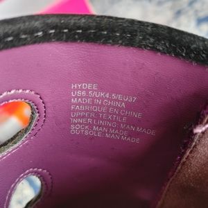 NIB (Hydee) Stiletto heeled bootie with crushed plum velvet, embroidered loop detail on the front, and ribbon tie up on the back. (tried on in house, but never worn). Size 6.5, but I'm a 7 and it fits comfortably, and I'd even be able to fit them with inserts and socks, so they may fit a 7.5. The heel is way too high for me. The first 4 stock photos are the true color.