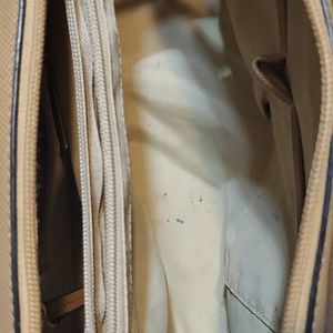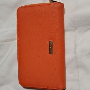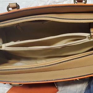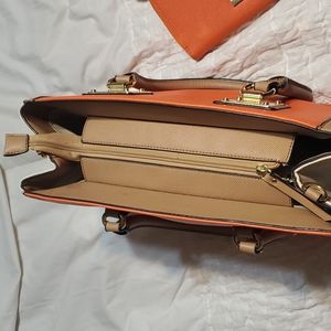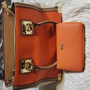Aldo , orange/beige purse is polyvinyl gently used. has 5 more pockets in purse . Has marks inside purse as seen on pictures.has a small button missing on corner. As seen on pictures. Wallet is in good condition. Has several pockets for credit cards middle zipper pocket. One side pocket.