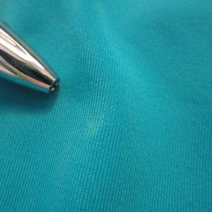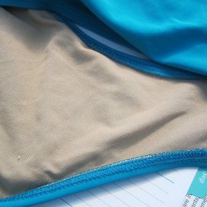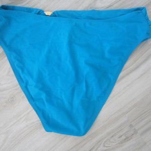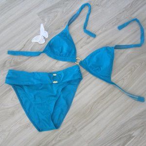 This turquoise bikini is just the thing for your next vacation trip to the tropics. Gently worn the bottoms measure 15" across when lying flat (not stretch) and stretch to 18" wide. The bottoms have an additional fashionable attached belt with a large gold ring. The top has removable pads and has three hoops at closure for best fit. 15.5" across bodice (just under bra cups) and stretches to 18" at widest possible closure. See all pictures (one small spot). Comes from a smoke free environment.