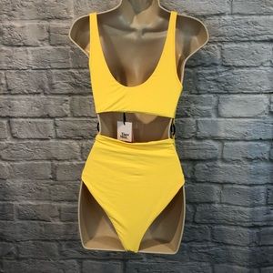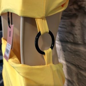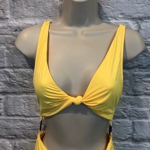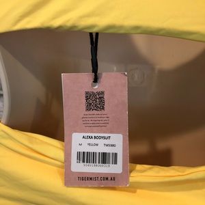 NWT Tiger Mist Women's Size Medium Neon Yellow Twist/O-Ring Alexa Bodysuit. Flawed, has tanner marks throughout the garment. See photos. No holes, rips, snags, pilling, pulling, peeling, fading or discoloration. Smoke free & pet friendly.