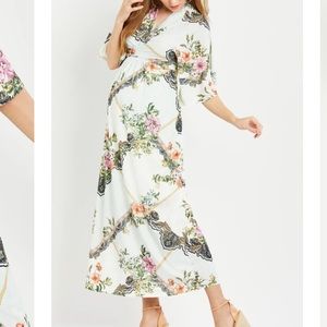 Dress up and step out in this floral maxi showstopper. The Jessica Simpson Wrap Kimono Sleeve Maternity Dress was made with you in mind. P.S. the flattering v-neck and wrap design makes this dress perfect for sunny days.