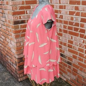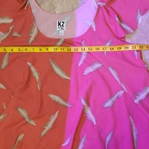 KZ Karen Zambos Feather in a pink/orange with tan & white Father, scalloped asymmetrical dress..